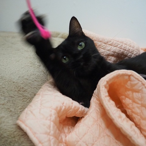 「おもちゃいくぜっ!」のスイッチオンまで時間かかります。ピンクさんへの反応は早めで、遊び甲斐あります♪ ヨロコブラが1番のお気に入りですが、しゃらしゃらするより、的一本の方が捕えやすいのかな? またたび希望です。 ヒョウ柄さんはもう匂いせずとも、毎晩一緒に寝ています。