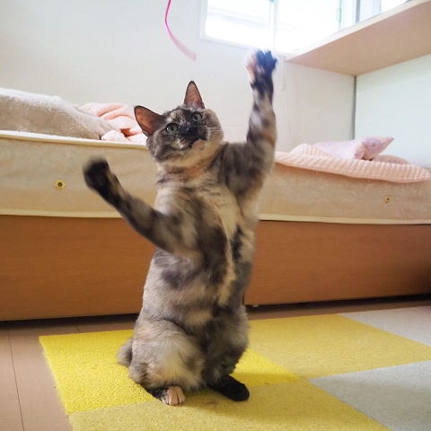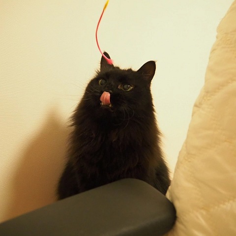 なかなか遊んでくれない子にもウケました。顔の前でちょろちょろ動かすと、後ろ脚で立ち上がりながら前脚をパタパタさせて捕まえようとします。毛布の隙間などに這わせるように動かすと、狙いを定めてから飛びついてきました。飽きないことを祈ります。